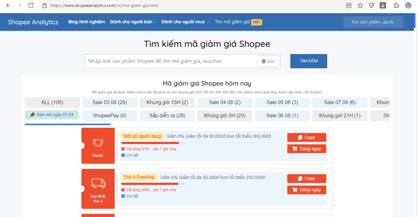 BƯỚC 2: Truy cập vào mục MÃ GIẢM GIÁ tại trang Shopeeanalytics. Sau đó dán link sản phẩm đã sao chép ở bước 1 vào ô tìm kiếm, Enter và sau đó các mã giảm giá siêu HOT sẽ hiện ra, bạn chỉ cần chọn mã bạn muốn rồi nhấn copy.