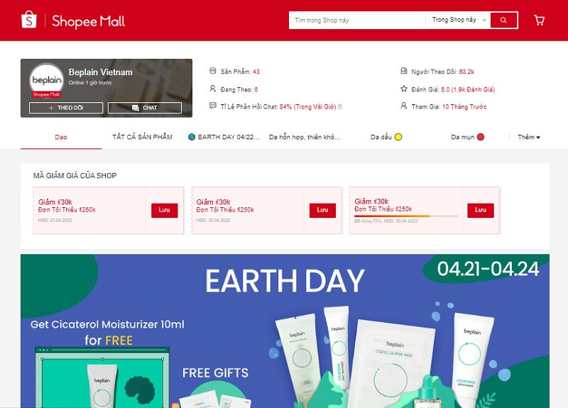 Beplain mới mở cửa hàng chính hãng trên Shopee vào 10 tháng trước nhưng hiện tại có tới hơn 60k người theo dõi. Cửa hàng nhận được 5/5 sao từ cả ngàn lượt đánh giá. Hiên tại, cửa hàng Beplain chính hãng đang phân phối 43 sản phẩm tời từ thương hiệu mỹ phẩm nổi tiếng của mình.