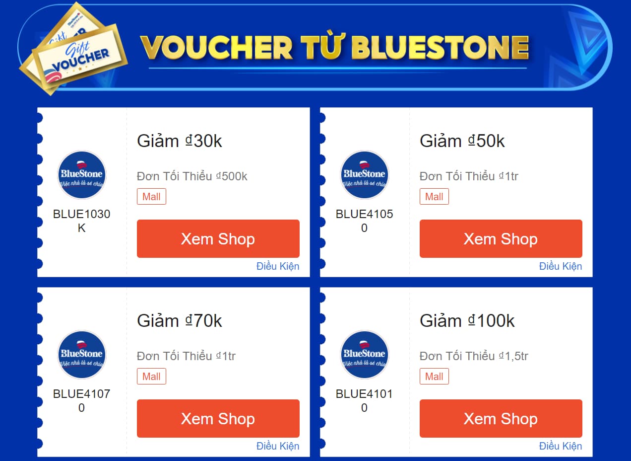 Ngoài các voucher từ nhà bán giảm 30K từ đơn 500K hoặc 50K từ đơn 1 triệu bạn còn có cơ hội săn voucher đến 1 triệu tại: https://shopee.vn/m/bluestone-uu-dai#vc vào 0h ngày 10/10.