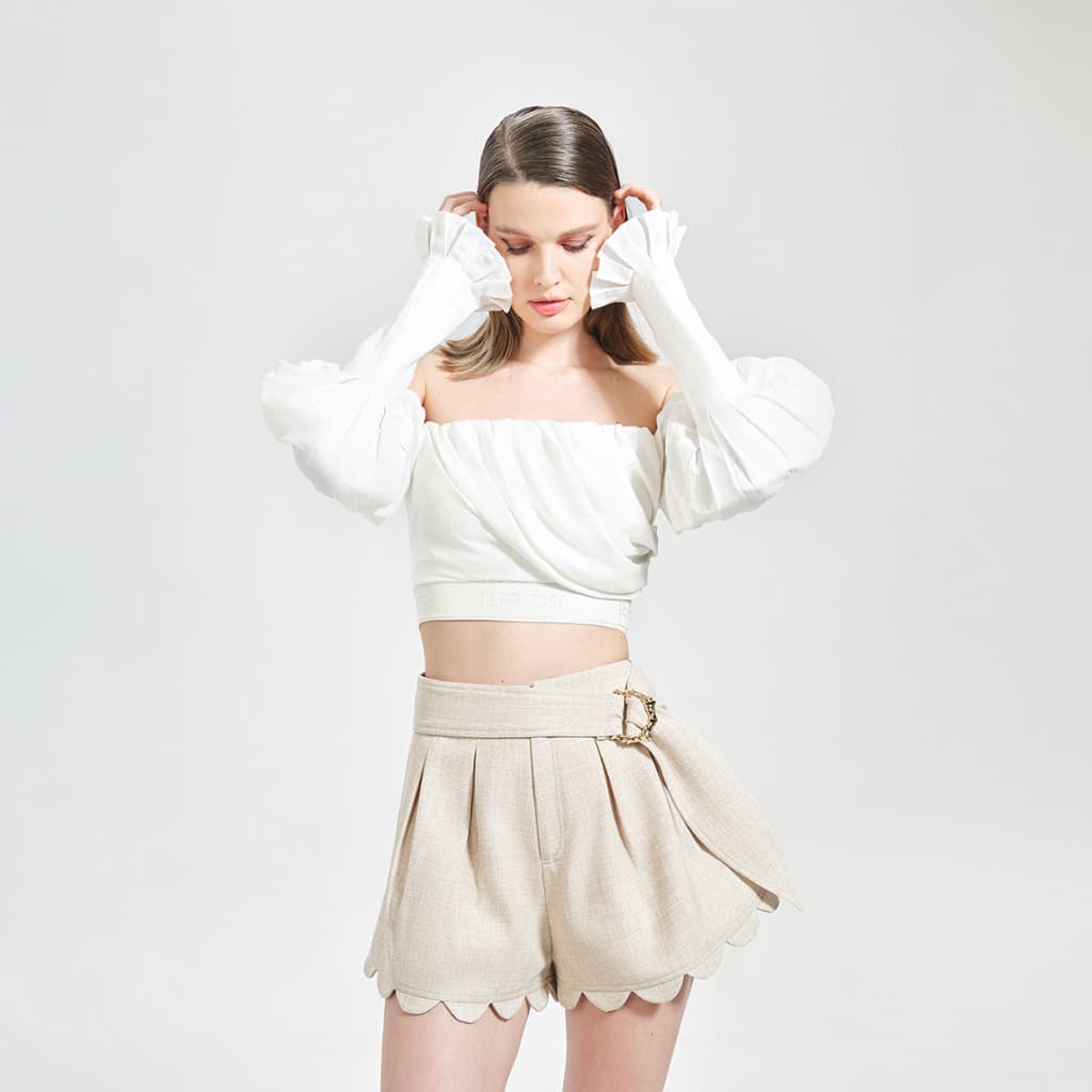 Áo kiểu trễ vai tay dài Atlantis vải linen trắng có thiết kế thanh khiết và đằm thắm cho những cô gái thích style nàng thơ. Áo kiểu phong cách croptop, thân trước nhún bồng tạo hiệu ứng, thân sau nhún thun co giãn, có khóa kéo. Phần tay áo phồng, ôm ở phần cổ tay, bên trong có vải lót viscose mịn mát, mang cảm giác thoải mái khi mặc.
