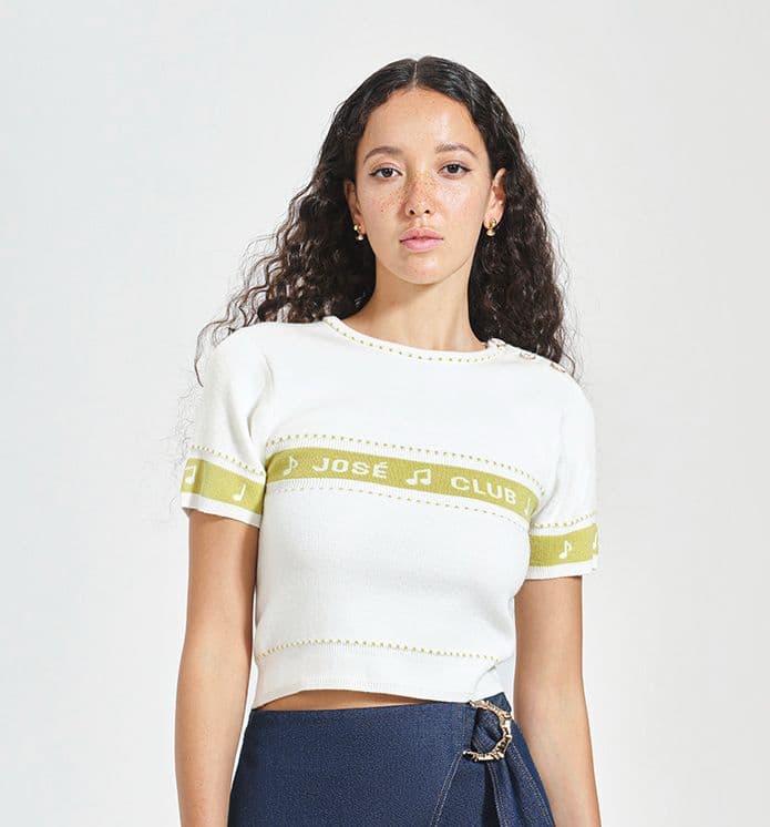 Áo thun kiểu nữ Sea Song vải cotton kiểu dạng croptop cổ tròn, thêu tay thủ công, có logo Dear Jose ở thân trước và sau. Trên vai trái có 3 khuy cài trang trí, áo không có lớp lót.