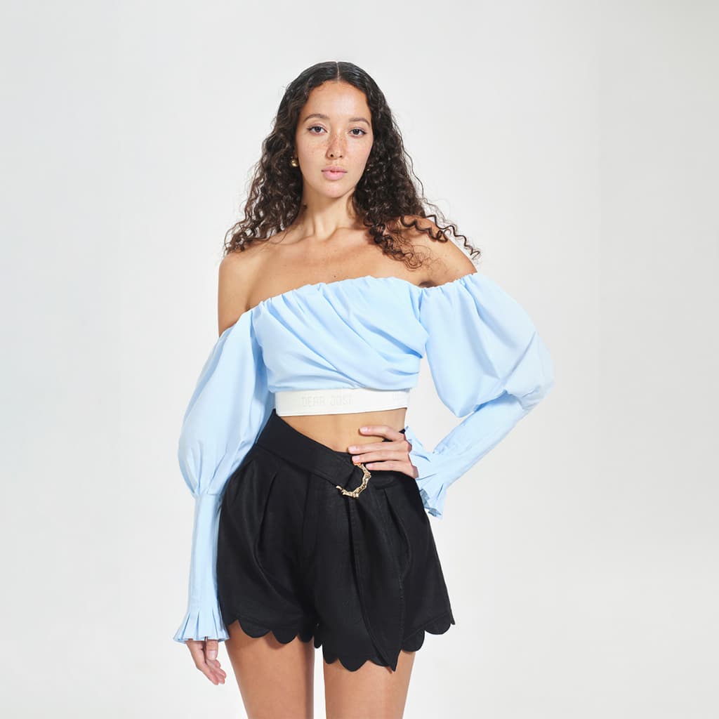 - Áo kiểu trễ vai tay dài Atlantis vải cotton poplin xanh