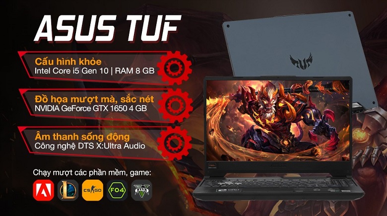Có thể nói Asus TUF Gaming FX506LH là chiếc laptop đậm chất gaming nhất từ thiết kế cho đến hệ thống xử lý. Chiếc laptop này có phần vỏ ở bên ngoài được thiết kế bằng kim loại cao cấp mang màu sắc xám bí ẩn, thu hút. Hơn nữa, trọng lượng của Asus TUF cũng khá nhẹ khoảng 2,3kg và chỉ dày 23mm giúp người sử dụng dễ dàng mang đi khi di chuyển mà không quá cồng kềnh. Với sự kết hợp gắn chip Intel Core i5 thế hệ 10 giúp máy tính có thể chịu tải nặng từ các loại gaming. Bộ nhớ RAM của Asus TUF cũng rất khủng có thể chứa hàng loạt các ứng dụng cùng lúc lên tới 8GB.