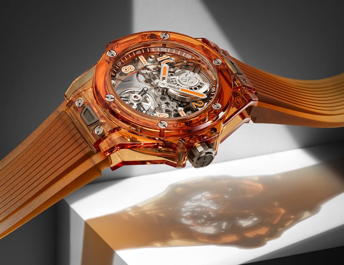 Sinh sau đẻ muộn vào năm 2021 Hublot Big Bang Tourbillon Orange Sapphire ra đời là một tân binh mang màu sắc mới gia nhập vào bảng màu bộ sưu tập những chiếc đồng hồ làm từ sapphire. Đây là một trong số ít những đồng hồ siêu sang mang lại cảm giác tươi tắn hoàn toàn mới từ nhà Hublot. Vẻ ngoài đáng yêu kết hợp từ vỏ tinh thể sapphire màu cam cùng bộ máy tourbillon tự động, Hublot Big Bang Tourbillon Orange Sapphire dễ dàng thu hút giới trẻ từ những cái nhìn đầu tiên.