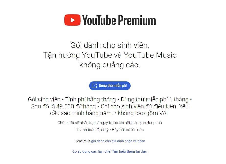 Bạn có thể mua gói thành viên YouTube Premium hoặc YouTube Music Premium với tư cách là sinh viên. Bạn sẽ có mọi lợi ích của gói tiêu chuẩn nhưng chỉ phải trả tiền theo mức giá 49.000 đồng/tháng, được miễn phí sử dụng tháng đầu tiên.