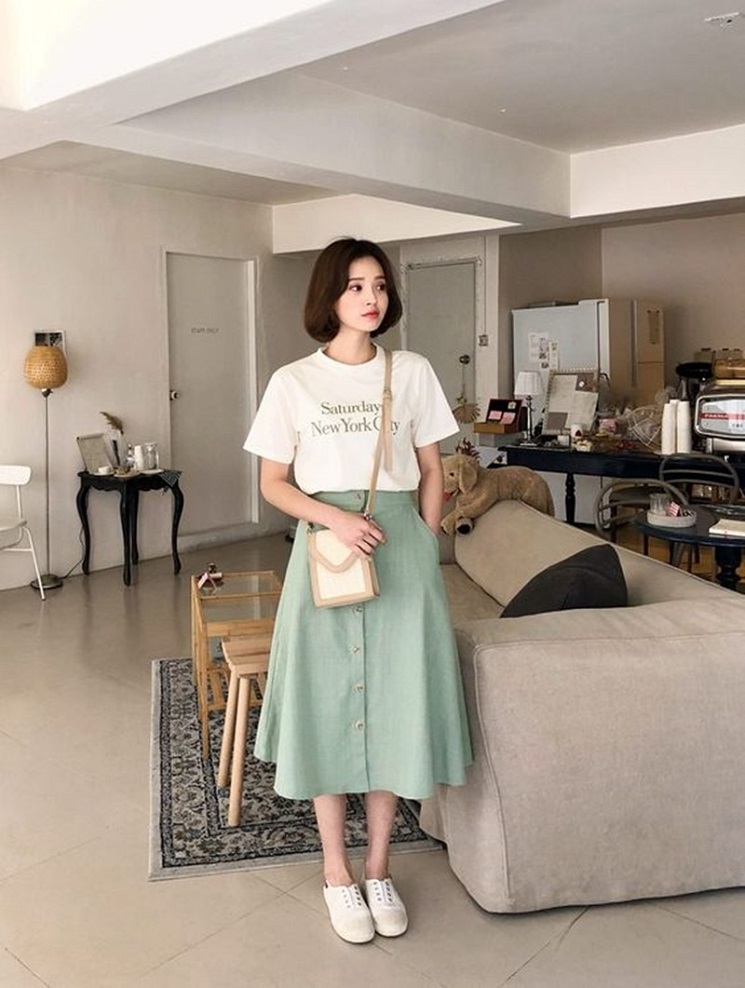 Bạn nên có một chiếc váy dài đen xoè, váy beige hoặc chiếc váy dài trắng trong tủ đồ của mình, bởi nó đặc biệt phù hợp để mix với chiếc áo thun trắng. Ngoài ra bạn có thể mix cùng một đôi giày mule khá thanh mảnh hoặc có thể là một đôi sneaker mang phong cách trẻ trung, năng động hơn. Bạn có thể diện đi bất cứ đâu, đi học, đi cà phê hay đi du lịch cùng bạn bè đều rất ổn.