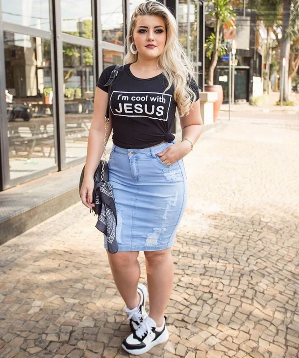 Chân váy Jean với áo thun có thể được coi là một set đồ thích hợp cho mọi hoàn cảnh. Dù là đi làm, đi học, đi chơi đều có thể diện được. Tuy nhiên, để tạo cảm giác thon gọn và trông cao hơn một tí, các nàng nên chọn áo thun kẻ sọc dọc, hay nhưng chiếc áo thun màu đen có họa tiết bắt mắt nhé. Kết hợp với chân váy jean có thiết kế đính cúc, hoặc váy jean rách cách điệu là sẽ có ngay 1 set đồ cực kỳ thời thượng. Để sự kết hợp này thêm hoàn hảo, các bạn có thể mix thêm balo hoặc túi xách, đặc biệt nhất là phải có thêm 1 đôi giày sneaker nữa nha!