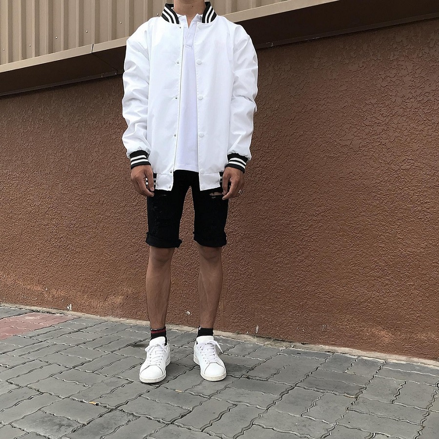 Bên cạnh gu thời trang lịch lãm thì nhiều bạn nam lại thích gu thời trang các tính, mạnh mẽ và có phần nổi loạn trong đó. Đôi khi một bộ trang phục chúng ta chỉ cần thay thế những chi tiết nhỏ là đã tạo nên một phong cách hoàn toàn khác mang những cá tính riêng biệt.Phối đồ với Bomber trắng như thế nào là nổi bật? Một chiếc Bomber trắng mix với chiếc áo thun hoặc một chiếc sơ mi mang họa tiết nổi bật. Tạo điểm nhấn cho trang phục bằng cách mix thêm với các phụ kiện như: mũ lưỡi trai màu sắc, chiếc quần jeans rách được xắn gấu hay những chiếc quần mang họa tiết độc đáo có phần chun ở cổ chân.