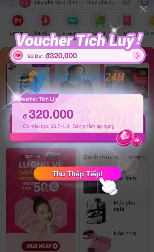 Voucher tích lũy thì bạn lấy ngay tại trang chi tiết sản phẩm có gắn logo voucher tích lũy hoặc lấy tại mục MÃ GIẢM GIÁ trang chủ app Lazada.