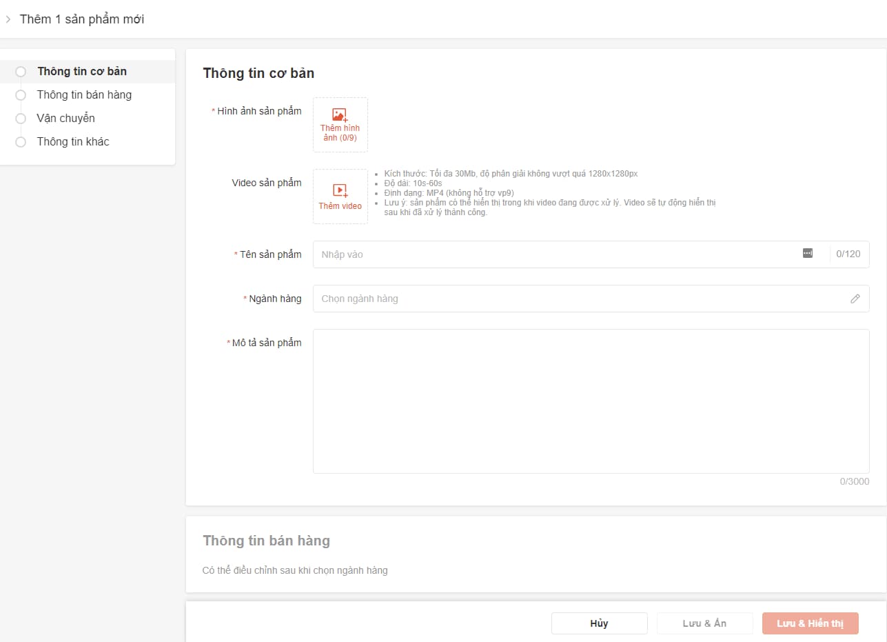 - Thông tin cơ bản: Nhập tên sản phẩm, thêm hình ảnh, video, ngành hàng và mô tả sản phẩm