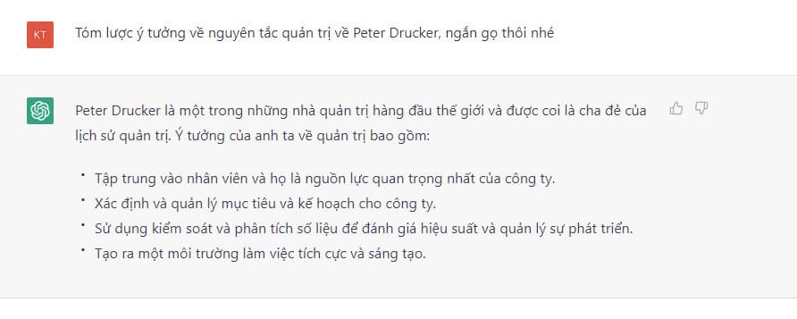 Qua hình ảnh trên bạn có thể thấy rằng, chỉ cần bạn nhập câu lệnh "Tóm lược ý tưởng về nguyên tắc quản trị về Peter Drucker" và yêu cầu chúng viết ngắn gọn thì nó sẽ đưa ra câu trả lời như hình trên. Từ ý tưởng đó mà bạn có thể phân tích ra được nhiều nội dung hấp dẫn hơn.