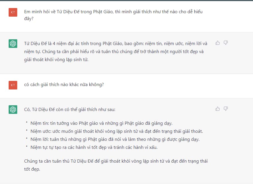 Ở trên là một ví dụ về việc ChatGPT giải thích hiện tượng Tứ Diệu Đế trong Phật Giáo là như thế nào, nếu nó giải thích chưa hài lòng bạn có thể yêu cầu thêm.
