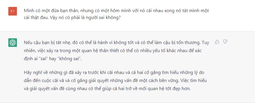 ChatGPT có thể giải thích rõ ràng, lành mạch việc đúng sai đạo đức. Nhìn vào hình ảnh trên bạn thấy đó, để nhận định việc ai đúng ai sai cần phải phân tích hoàn cảnh rõ ràng, chứ không thể đưa ra câu trả lời đúng sai liền được.