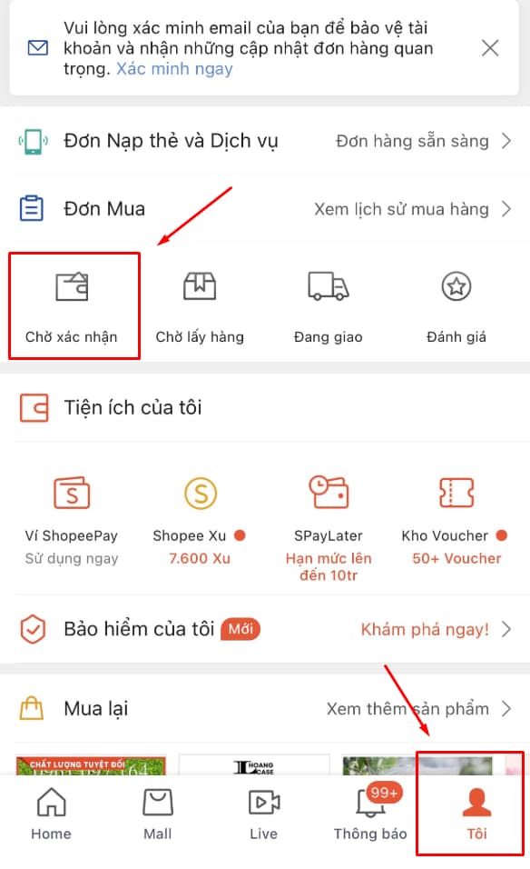 - Bước 1: Vào mục Tôi => Chờ xác nhận => Chọn đơn hàng cần thay đổi địa chỉ nhận hàng