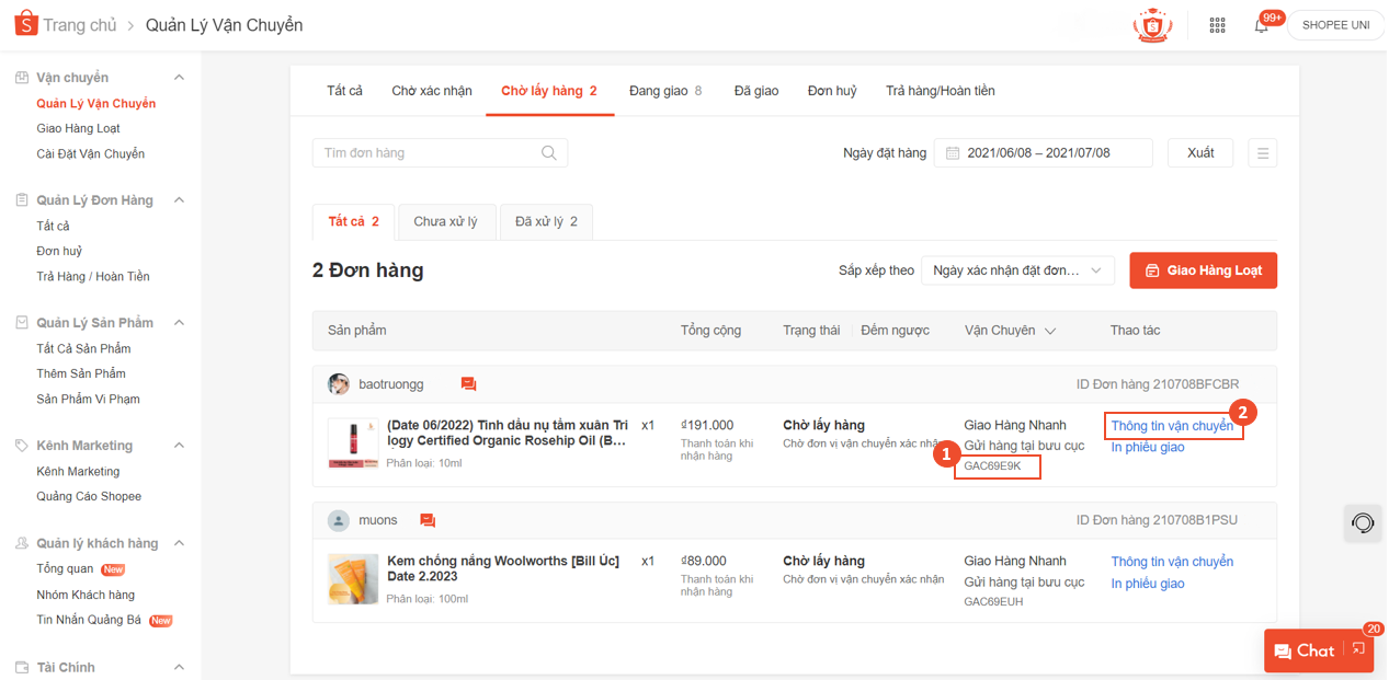 Shop có thể xem chi tiết mã vận đơn cho các đơn hàng tại mục Vận chuyển (1) hoặc Thông tin vận chuyển (2)