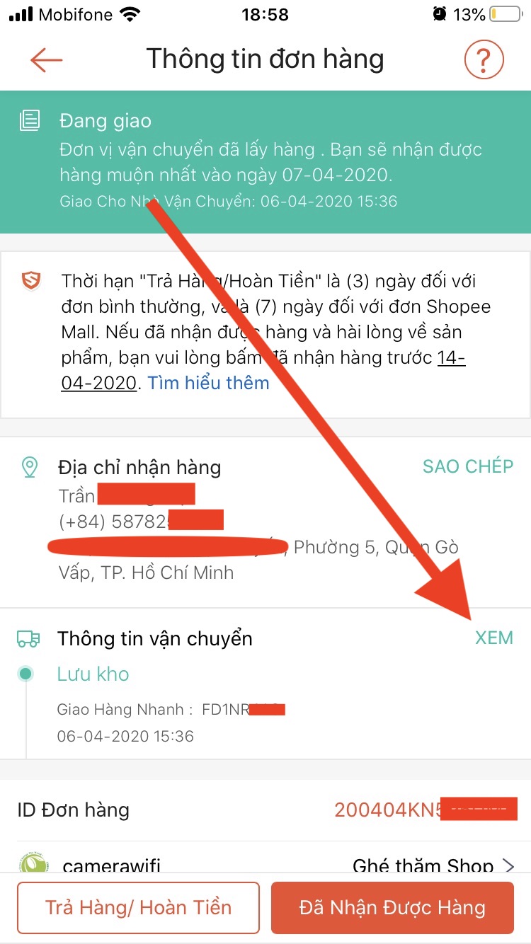 - Bước 2: Tại phần thông tin vận chuyển > chọn Xem, bạn sẽ thấy hiển thị thông tin Mã vận đơn