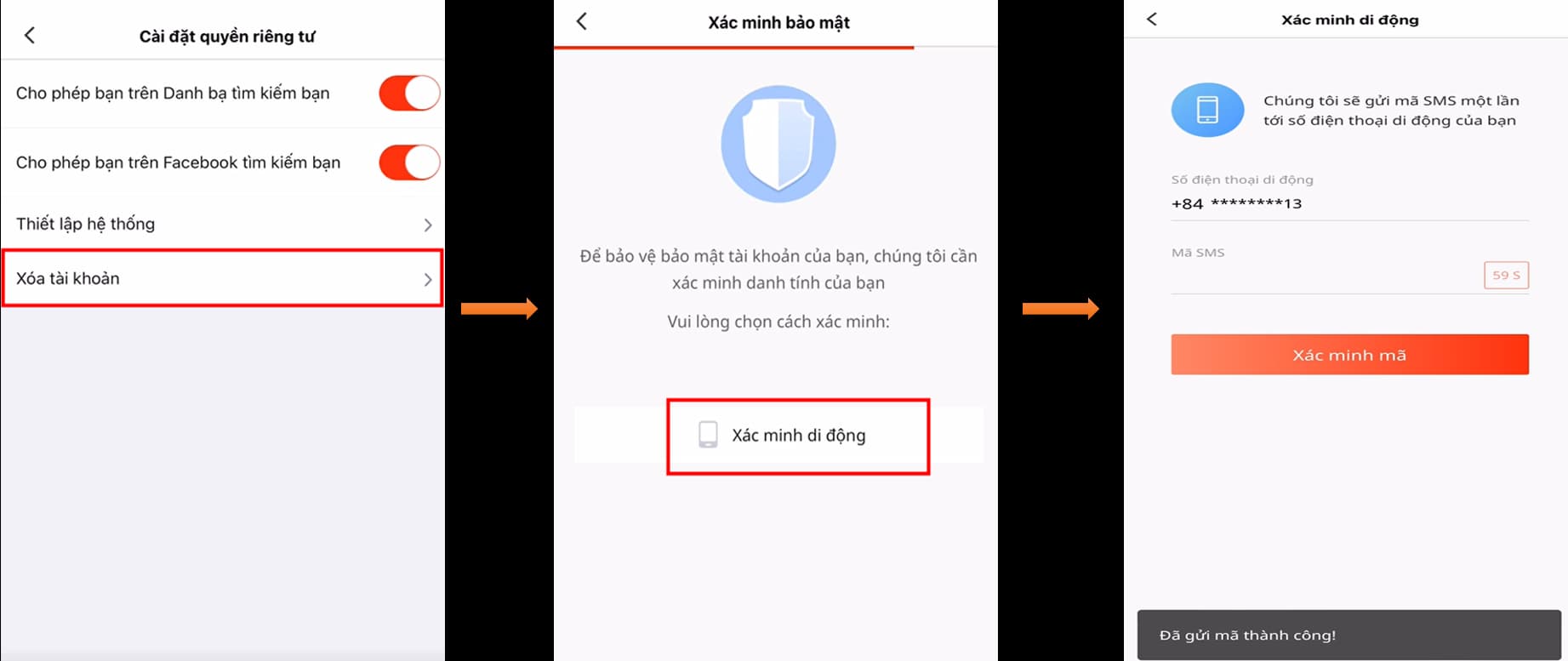 Bước 3: Chọn xóa tài khoản => Xác minh bảo mật => Nhập mã OTP được gửi về số điện thoại đã đăng kí tài khoản Laz trước đó.