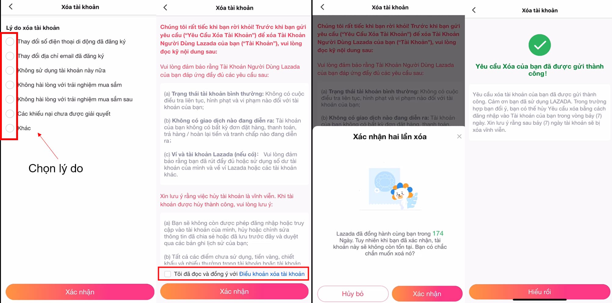 - Tài khoản bạn yêu cầu xóa không bị điều tra hoặc vi phạm điều khoản sử dụng của Lazada và pháp luật.