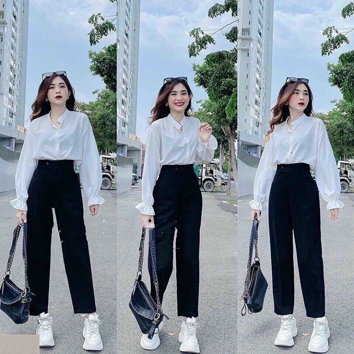 Set đồ gồm áo sơ mi tay bèo và chiếc quần baggy màu đen. Mẫu quốc dân này không còn xa lạ gì nữa. Chất liệu vải lụa khỏi phải bàn, tay bèo mang phong cách tiểu thư lịch sự mà kín đáo. quần dài co dãn tốt, có lưng thun đằng sau tha hồ mà chỉnh vừa eo theo ý muốn. Em này mà đi chơi đi làm đặc biệt về ra mắt nhà người yêu thì hết nước chấm.