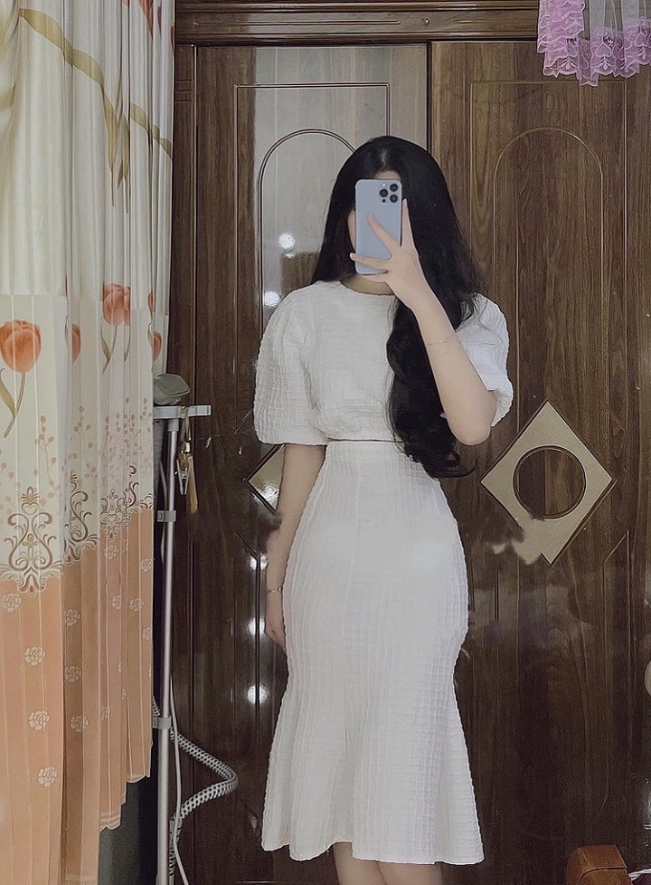 Set đồ gồm áo ngắn và một chiếc váy đuôi cá màu trắng hết sức thanh lịch và sang trọng. Áo tay bồng tiểu thư cùng váy đuôi cá ôm hông làm phô ra vòng 3 quyến rũ của bạn rất tôn dáng khiến ai cũng phải ngước nhìn. Có lớp lót và form lên chuẩn nên các nàng cứ tự tin rước em nó về nhé đi trà chiều hay du lịch siêu đẹp luôn.