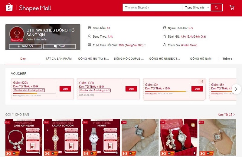 TIF WATCHES là một cửa hàng đồng hồ uy tín trên Shopee, nổi tiếng với các sản phẩm chất lượng và kiểu dáng đa dạng. Nổi tiếng trong việc cung cấp các mẫu đồng hồ thời trang và chất lượng, TIF WATCHES không chỉ mang lại sự lựa chọn đa dạng mà còn đảm bảo về uy tín và sự hài lòng của khách hàng. Tại đây, bạn có thể dễ dàng tìm thấy những mẫu đồng hồ phong phú từ các thương hiệu nổi tiếng với mức giá phải chăng và chất lượng đáng tin cậy.
