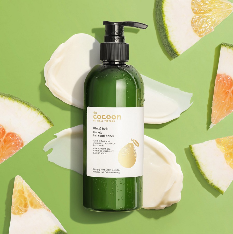 Sản phẩm có bao bì màu xanh nhạt hơn so với dầu gội. Về bảng thành phần, dầu xả bưởi Cocoon được tạo nên từ Vitamin B5 và axit amin. Trong đó, vitamin B5 giúp dưỡng tóc, cung cấp độ ẩm, ngăn ngừa hư tổn và tăng độ bóng mượt cho tóc. Axit amin có tác dụng củng cố cấu trúc, bảo vệ màu tóc và giảm sự hư hỏng trên bề mặt tóc.