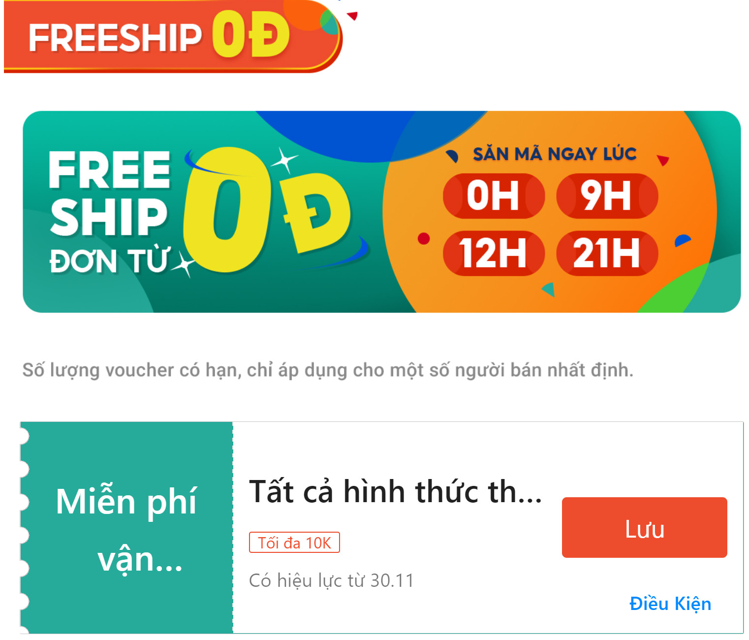 - Miễn phí vận chuyển cho đơn 0 đồng với số lượng lớn vào các khung giờ vàng 0h, 9h, 12h và 21h.