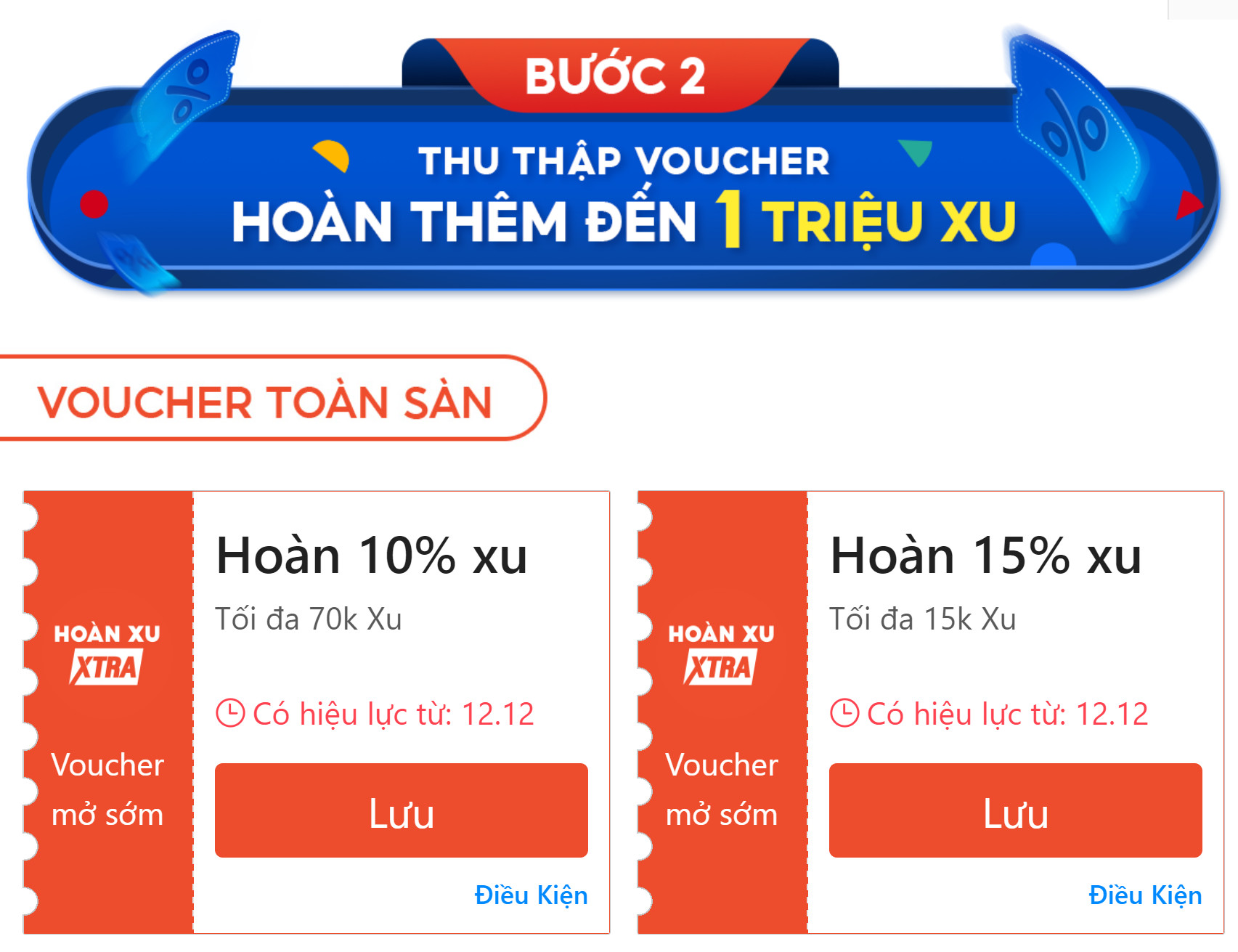 Bước 2: Thu thập thêm voucher hoàn xu toàn sàn và voucher hoàn xu ngành hàng