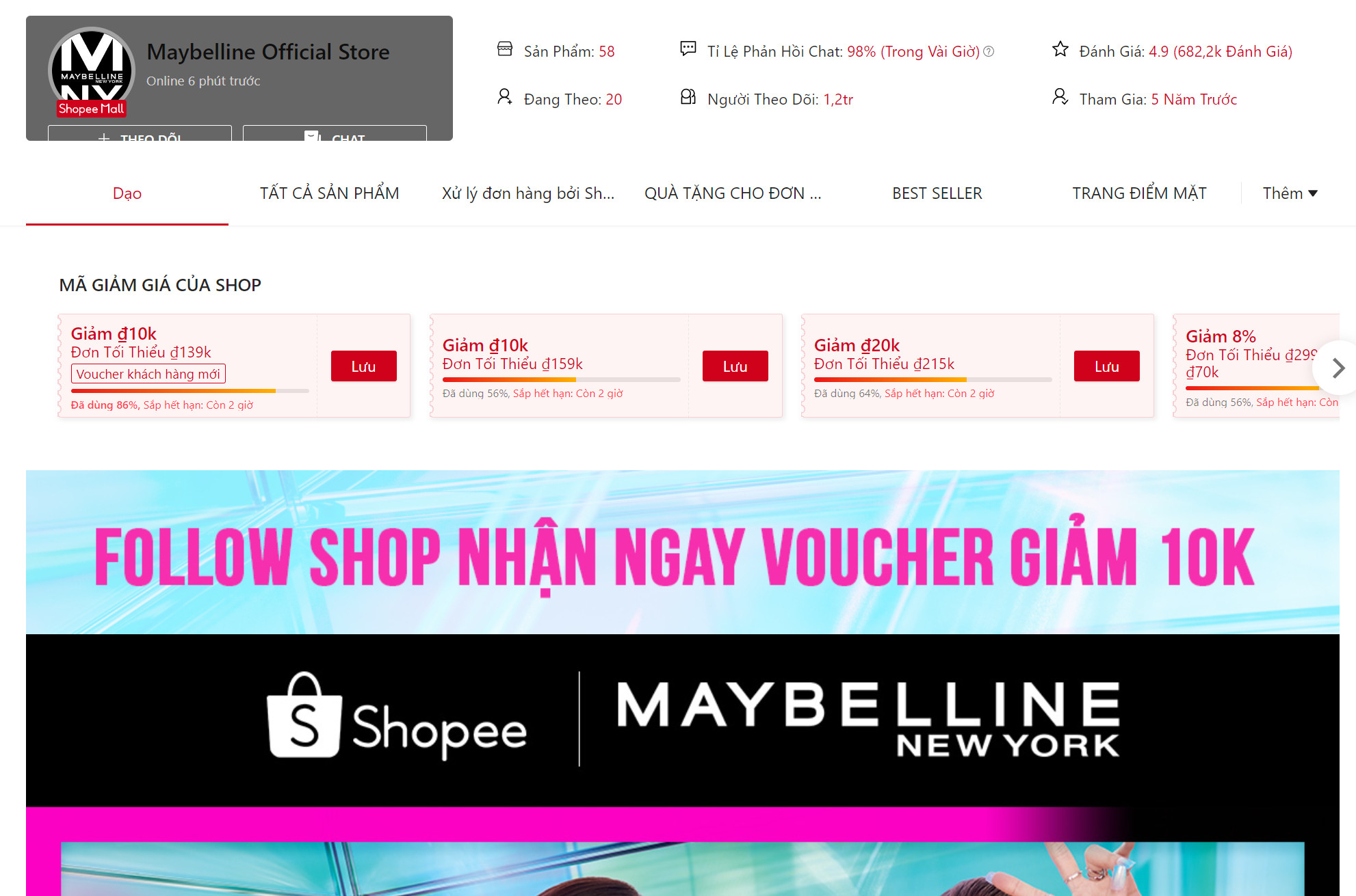 Maybelline là hãng mỹ phẩm từ Mỹ đã quá quen thuộc với nhiều thế hệ người dùng Việt. Hãng nổi tiếng bởi các sản phẩm như: son lỳ, phấn má, kem nền, mascara, kẻ mắt… Tới với sinh nhật Shopee 12.12, thương hiệu này tặng bạn ưu đãi tới 50% kèm loạt deal sốc không giới hạn gồm toàn sản phẩm hot mới ra mắt. Nhanh tay truy cập shop ngay để săn deal sớm nhé.