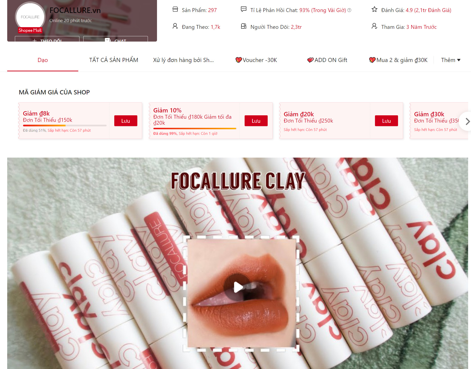 Được biết đến là một thương hiệu mỹ phẩm nội địa Trung đình đám, thời gian gần đây Focallure đã nhanh chóng phủ sóng mọi nền tảng đặc biệt là Shopee. Các sản phẩm của hãng ghi nhận tới hàng trăm nghìn lượt bán các loại nổi bật phải kể tới: son môi, phấn phủ, kem nền, che khuyết điểm….