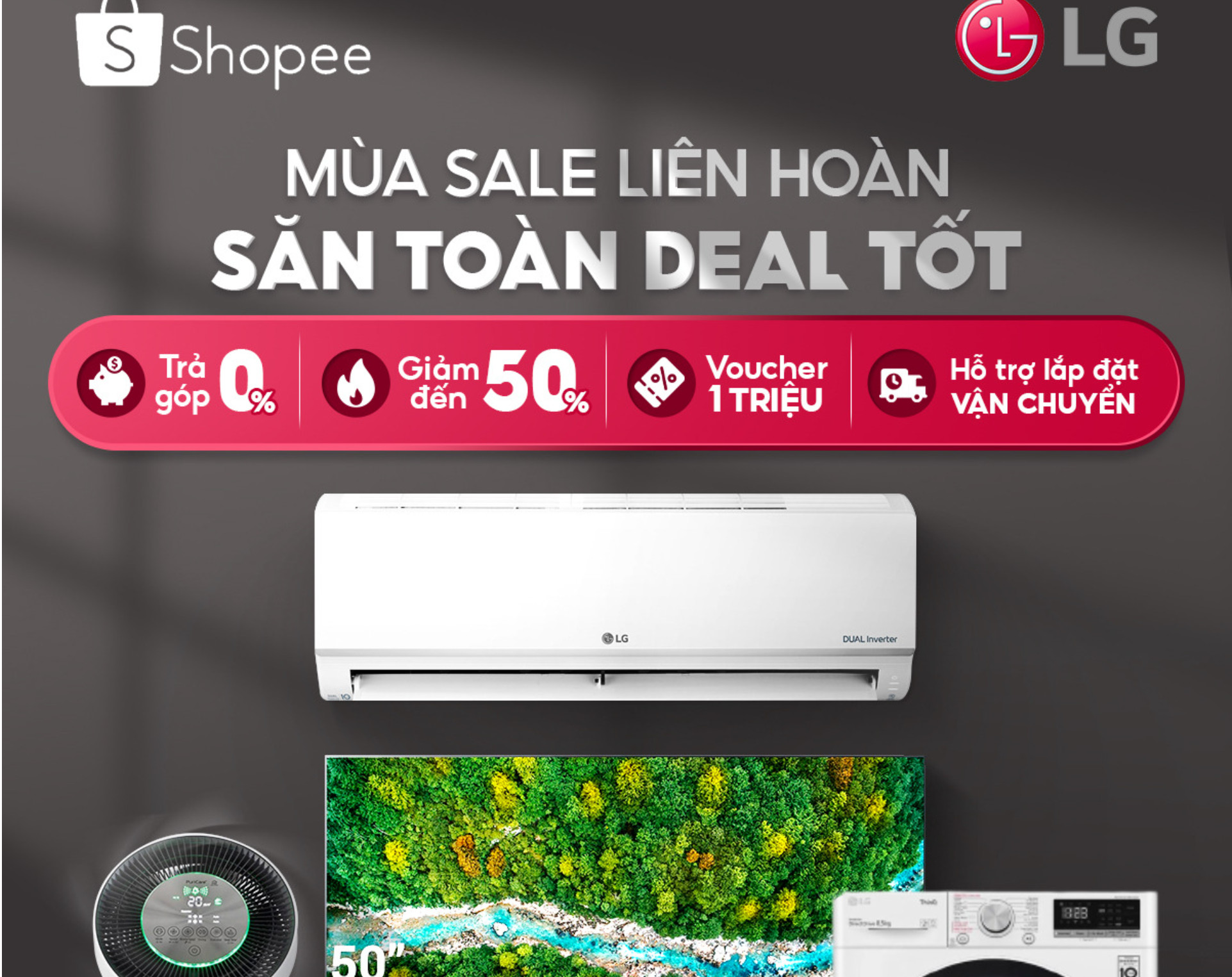 Không chỉ có các thương hiệu mỹ phẩm giảm sâu mà ông lớn LG cũng gia nhập cuộc đua giá xịn dịp Shopee 12.12. Các mặt hàng đua sale đều là các sản phẩm làm nên tên tuổi của hãng như TV, máy lọc không khí, điều hoà, máy giặt… với mức giảm lên tới 50%, trả góp 0 đồng, tặng thêm voucher 1 triệu. Đây đều là các mặt hàng giá trị cao nên mức giảm phải nói là siêu khủng.