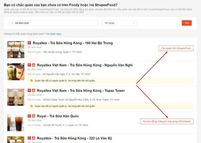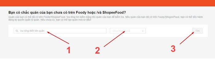 - Bước 2: Tìm quán của bạn theo tên quán và khu vực để kiểm tra thực tế xem đã tồn tại hay chưa vì có thể nhiều khi người dùng đã đăng ký trước đó rồi nhưng lại chưa tiến hành bước đăng ký cuối cùng để quán có thể hiển thị trên ShopeeFood.