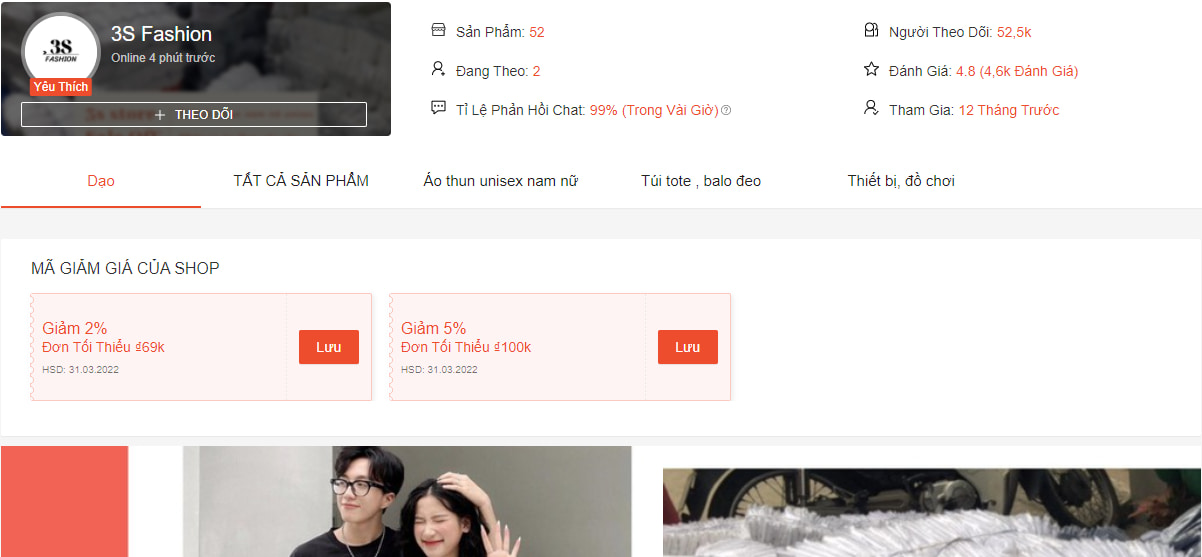 Đặc biệt, shop thường xuyên tung ra các đợt Flash Sale cũng như các mã giảm giá cực khủng. Ví dụ như Voucher giảm 2% cho đơn tối thiểu 69K, hoặc giảm 5% cho đơn tối thiểu 100K. Dạo 1 vòng quanh shop thì mình nhận thấy các sản phẩm như áo thun, áo phông đều có lượt bán ra lên đến gần 2k. Hiện, shop đang kinh doanh các mặt hàng như: