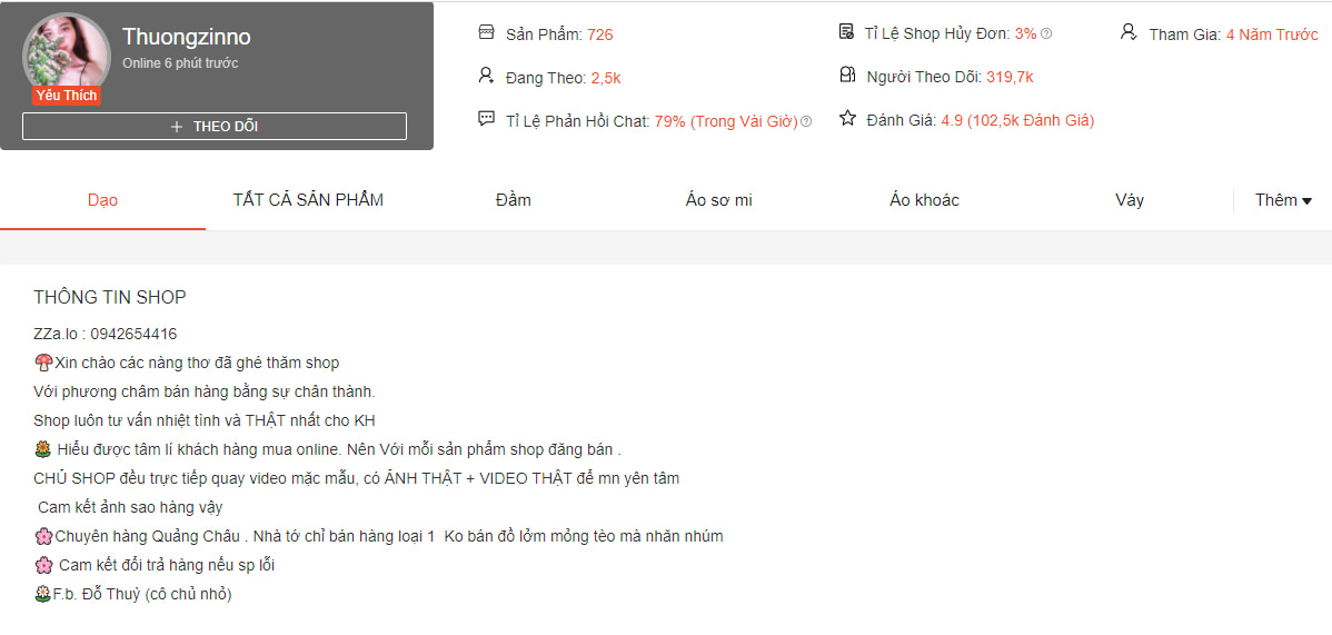 Thương Zinno - một trong những shop quần áo mùa hè mình đã mua đi mua lại rất nhiều lần trên Shopee. Với lượt theo dõi khủng 319.6k và 102.5k đánh giá 4.9/5* thì đây thực sự là một shop đáng tiền mà ai cũng nên trải nghiệm ít nhất một lần. Các sản phẩm của shop dao tộng từ 50K - 500.000K, nhưng chủ yếu là nằm ở mức 100K - 200K. Vậy cho nên thu hút được sự đông đảo học sinh, sinh viên ghé thăm.