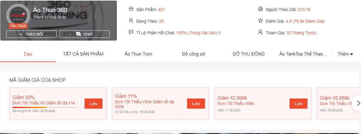 Nếu là một "con nghiện" của Shopee thì chắc chắn sẽ biết tới Áo Thun 360 - một store rẻ đẹp có tiếng. Shop đã kinh doanh trên Shopee khá lâu (khoảng 33 tháng) và có lượng theo dõi khủng lên đến 210.7k, 78.9k đánh giá 4.8/5*, tỉ lệ phản hồi chat, chăm sóc khách hàng là 100%. Nhờ vậy có thể thấy đây là một shop bán quần áo mùa hè quá uy tín, chất lượng và đáng để mua.
