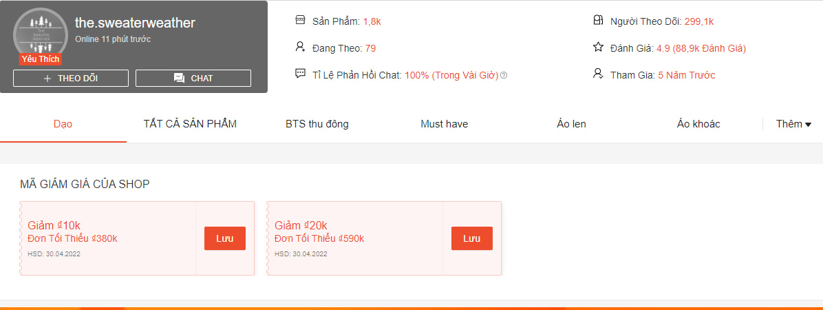 The Sweater Weather – Shop bán quần áo mùa hè chất lượng trên Shopee không thể bỏ lỡ. Shop đã có gần 300k lượt theo dõi và 88.9k đánh giá 4.9/5*. Chất lượng mặt hàng của store quả thực quá ổn so với giá thành. Mình cũng đã mua hàng ở đây khá nhiều lần và chưa khi nào phải thất vọng cả.
