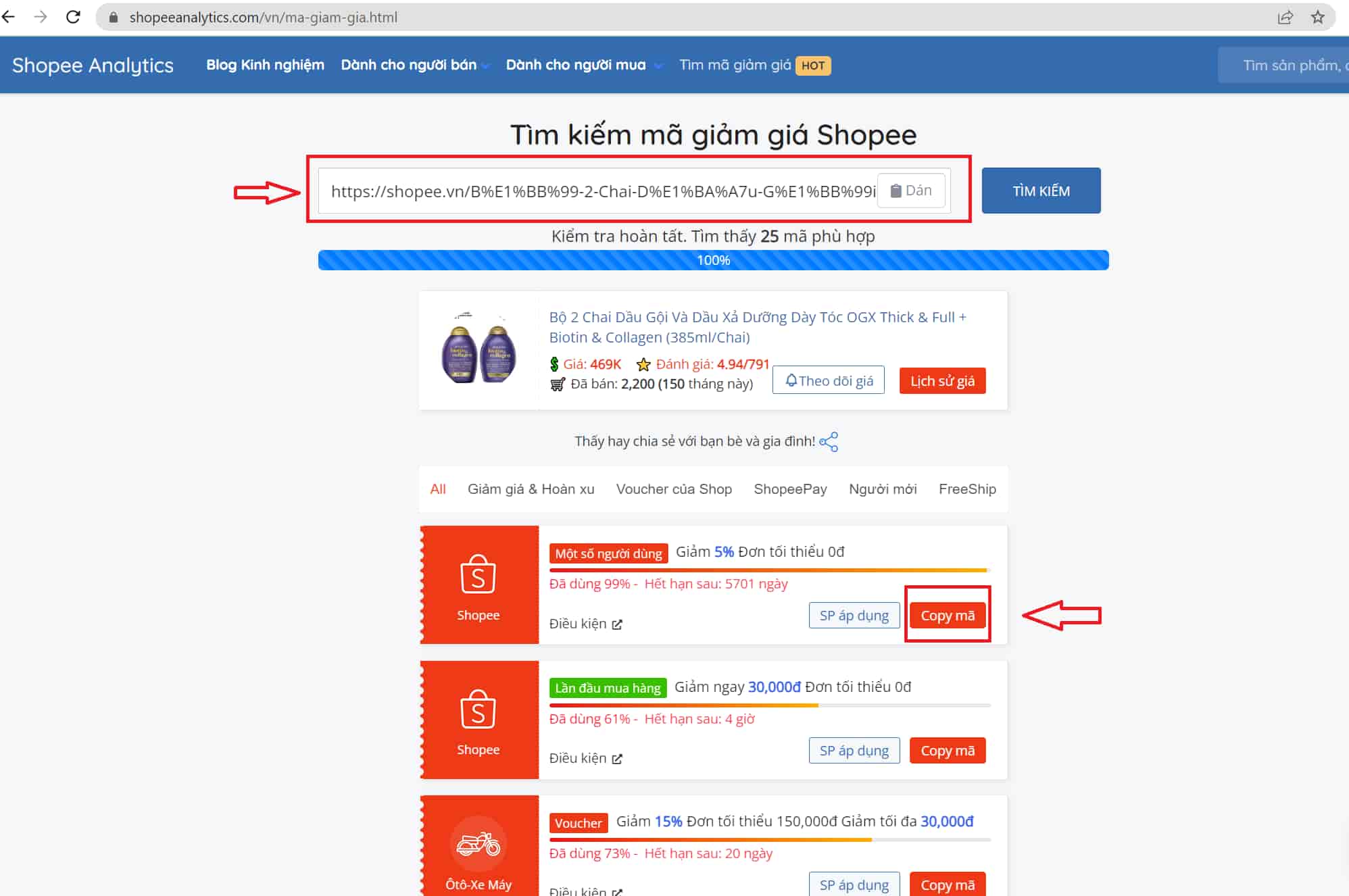 - Bước 2: Vào ShopeeAnalytics.com click chọn "Tìm mã giảm giá" rồi dán link sản phẩm, sau đó copy mã giảm giá phù hợp.