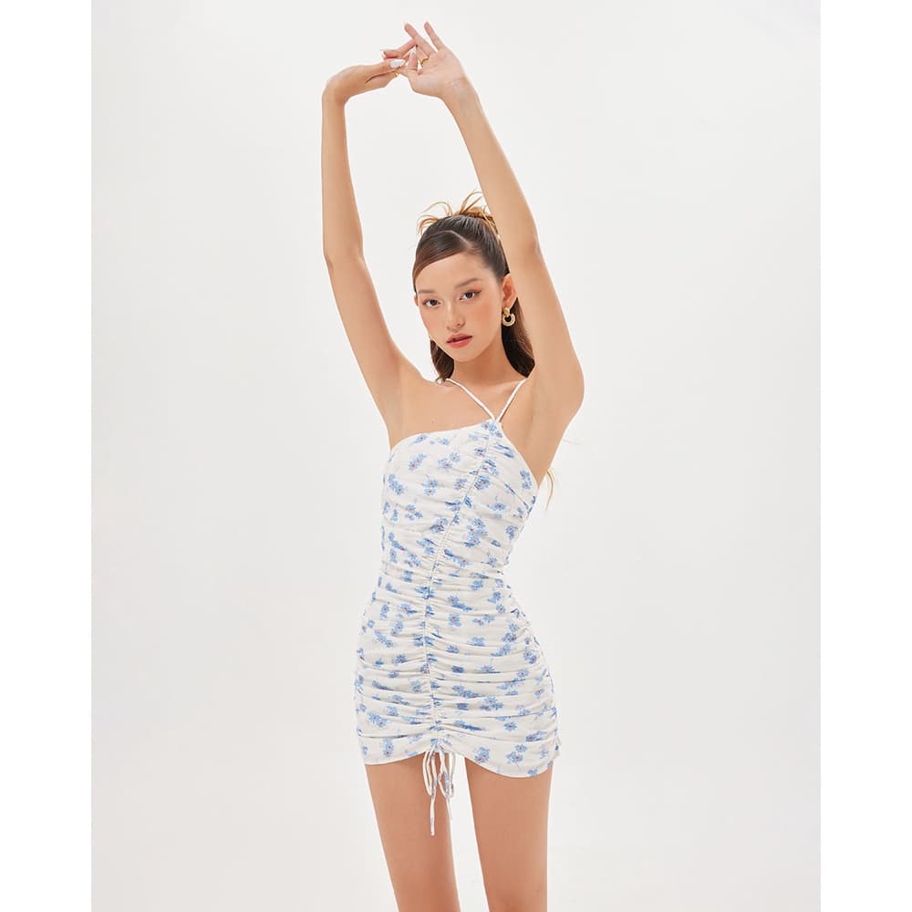 Đầm ôm SheByShj màu trắng hoạ tiết hoa xanh - White Killa Dress thiết kế gần giống dạng váy cổ yếm. Đặc biệt hơn là váy còn có phần dây rút, thế nên bạn hoàn toàn có thể điều chỉnh độ ngắn dài theo ý muốn. Họa tiết hoa nhí màu xanh trên váy nhìn khá đơn giản nhưng khi diện lên thì lại vô cùng nổi bật đó nhé.