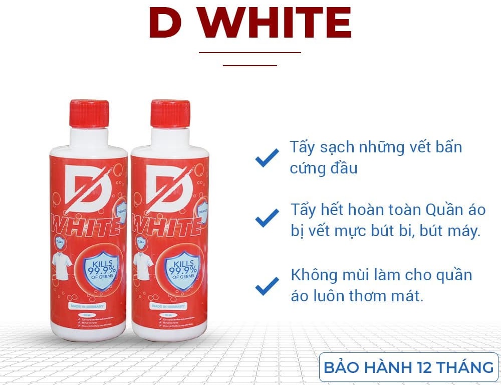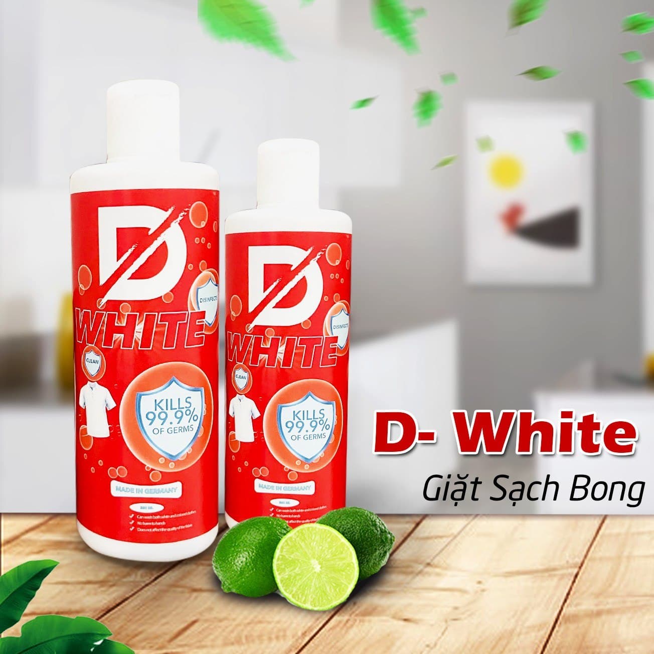 Nước tẩy trắng quần áo D White có xuất xứ từ Đức, đây là sản phẩm tẩy quần áo cực kì được ưa chuộng tại Việt Nam nói riêng và thế giới nói chung. Nước giặt có công dụng diệt khuẩn, tẩy sạch những vết bẩn "cứng đầu" nhất, dù là vết mốc, sơn, vết mực bút bi, bút màu...