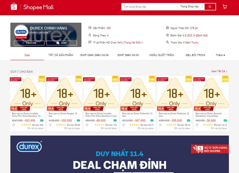 Gian hàng chính hãng của Durex trên Shopee được thành lập cách đây 4 năm. Hiện nay, Durex đã phát triển và mở rộng gian hàng chính hãng của mình trên Shopee. Cửa hàng hiện đang có 278,3k người theo dõi, phân phối 166 sản phẩm và đạt 4,8/5 sao cho các lượt đánh giá của khách hàng. Không chỉ thế, Durex cũng luôn quan tâm chăm sóc và tư vấn để khách hàng có thể chọn được sản phẩm ưng ý và có trải nghiệm mua hàng tốt nhất. Đến với Durex, bạn sẽ không lo về chất lượng và uy tín nhé!