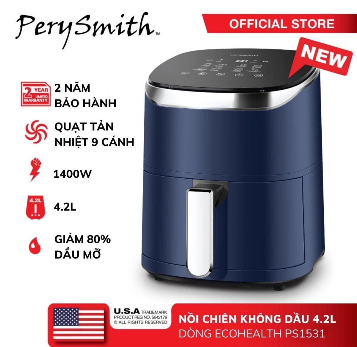 Nồi chiên không dầu điện tử 4.2L PerySmith với thiết kế màu xanh dương hiện đại. Công nghệ ECOHEALTH giúp giảm 80% lượng dầu mỡ trong thực phẩm. Nồi có công suất 1400W giúp chế biến thực phẩm nhanh chóng, dung tích 4.2L có thể nướng gà nguyên con, thích hợp với các gia đình 3 - 5 người. Đặc biệt, nồi còn được trang bị hệ thống làm nóng 3D 9 cánh, giúp làm nóng nhanh và tiết kiệm điện năng.