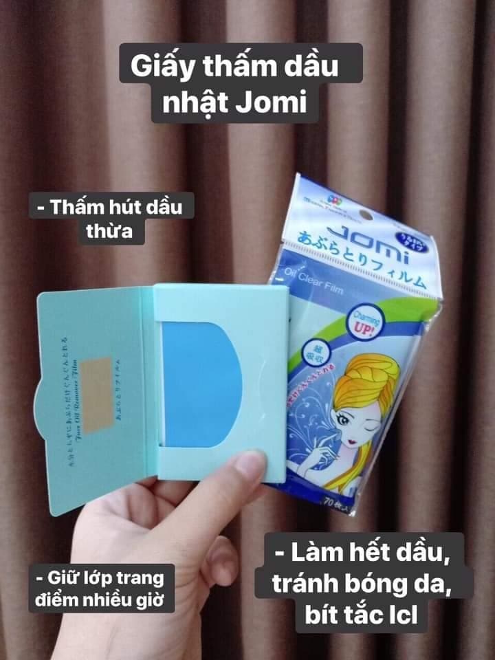 Giấy thấm dầu Jomi hay còn có tên gọi khác là phim thấm dầu. Jomi là nhãn hiệu film thấm dầu thế hệ mới từ Nhật Bản, với khả năng thấm hút gấp 300% so với tất cả các sản phẩm thấm dầu truyền thống. Sản phẩm lấy dầu bằng cơ chế cơ học ở mức độ nano, làm thông thoáng bề mặt da, giảm thiểu sự phát triển của mụn và bảo vệ trang điểm, giúp da mặt bạn sẽ trở nên khô thoáng và dễ chịu tức thì ngay sau khi sử dụng.
