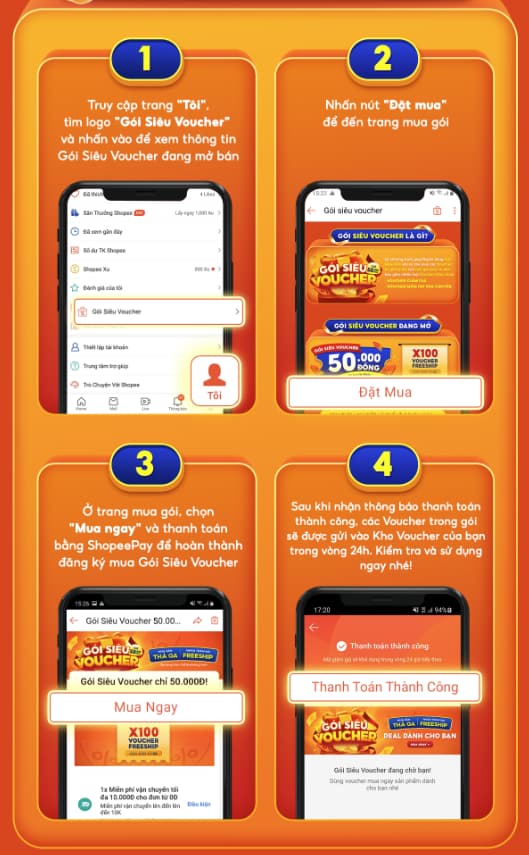 - Các Voucher được mua từ các gói siêu Voucher chỉ áp dụng để thanh toán các đơn hàng trên ứng dụng Shopee với một số hạn chế nhất định được ghi rõ trong Thể lệ chương trình của từng gói (nếu có).