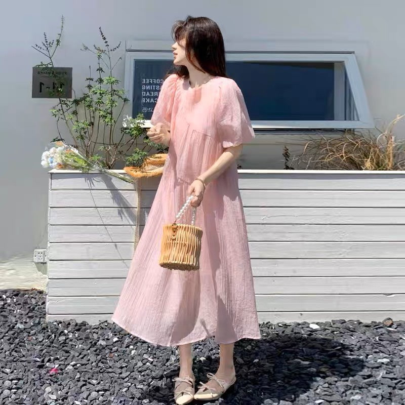 Váy đầm hồng liền áo tay ngắn ngọt ngào phong cách Hàn Quốc MS394