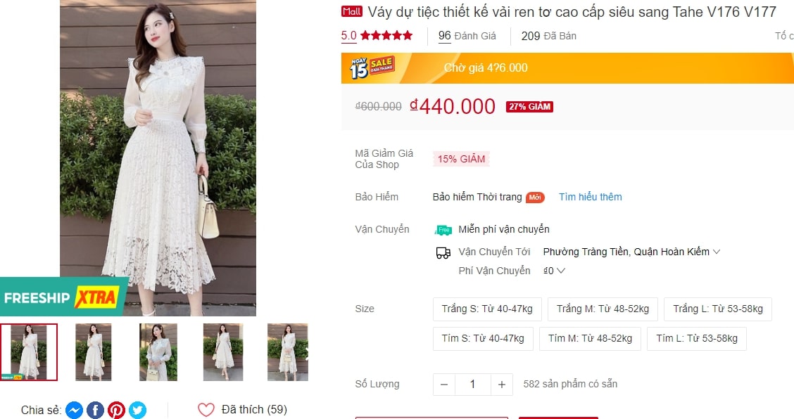 Bảng size đầm Tahe V176 V177: S, M, L tương đương cân nặng của chị em từ 40- dưới 60kg.