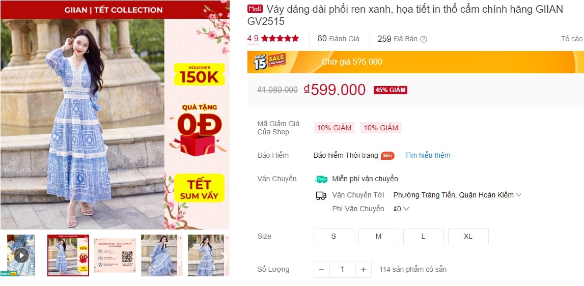 Kích thước váy GIIAN GV2515: S-M-L-XL tương đương chị em có số cân từ 40-65kg.