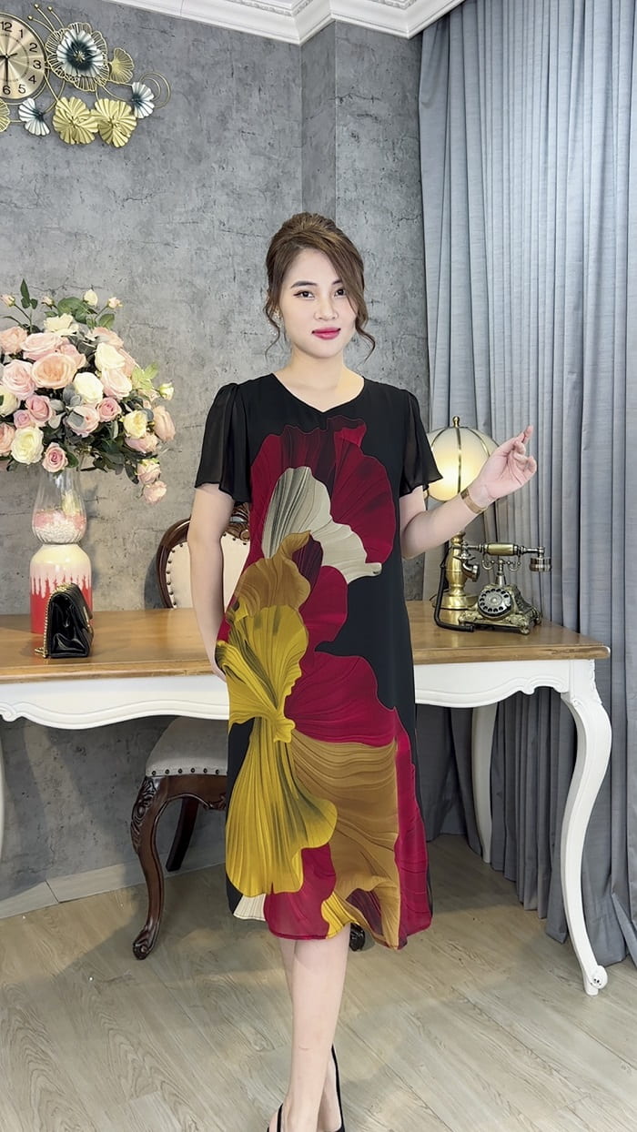 Đầm trung niên được thiết kế dáng xòe, dáng dài, tay ngắn, chất liệu co giãn nhẹ nhưng tạo được cảm giác thoải mái. Đầm dự tiệc trung niên dáng ngồi rất dễ mặc và tôn dáng, những người có eo một chút thì vẫn có thể mặc được để che bụng rất tinh tế.