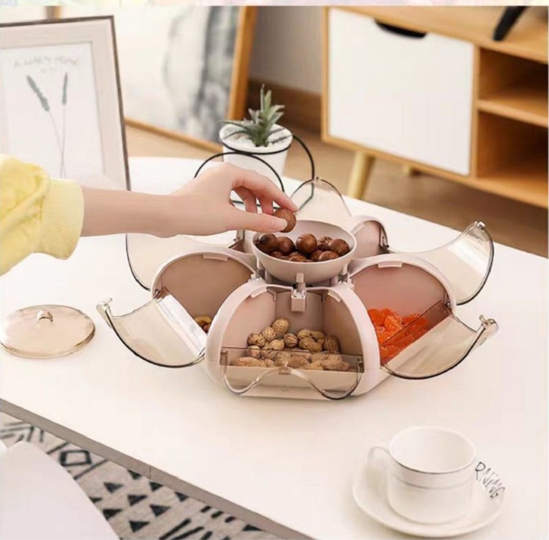 Khay mứt được làm từ nhựa cao cấp, an toàn cho người dùng và không bị ám mùi nhựa lên đồ ăn. Thiết kế khay có hình bông hoa 6 cánh bung ra rất đẹp mắt và gọn gàng với màu sắc trang nhã, phù hợp với mọi gia đình. Sản phẩm có 1 đầu nắp chỉ cần ấn đầu nắp đó là 6 cánh bung khay ẩn ra, nhìn vô cùng đẹp và lạ mắt.