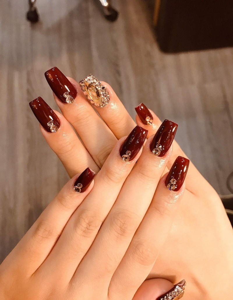 Mẫu nail đẹp điển hình cho ngày Tết không thể không nhắc đến các phụ kiện như đá pha lê, đá hoa,... với nhiều màu và kích cỡ theo sở thích của từng người. Bạn có thể tạo điểm nhấn cho bộ nail của mình bằng cách gắn đá lên trên cũng khá ấn tượng. Đây là mẫu nail đặc biệt hợp với các cô gái yêu thích sự quyến rũ và nổi bật. Việc sở hữu một bộ nail gắn đá sẽ góp phần mang đến vẻ nổi bật và dễ dàng tạo được sự ấn tượng với nhiều người xung quanh.