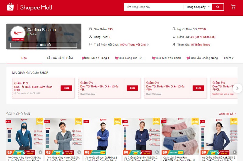 Cardina Fashion là một shop vô cùng uy tín trên Shopee về áo chống nắng nam với lượt người theo dõi là 208,5k và lượt đánh giá lên đến tận 4.9 nên đây là một shop vô cùng được mọi người tin tưởng. Đặc biệt shop thuộc Shopee Mall nên bạn có thể hoàn toàn tin tưởng khi mua hàng bên Shop.